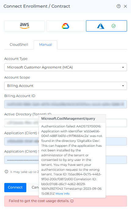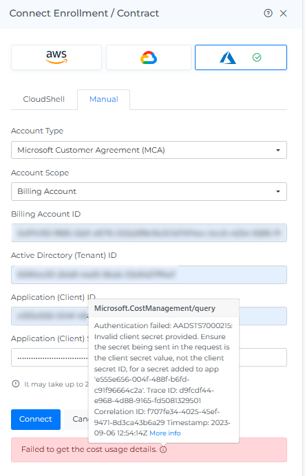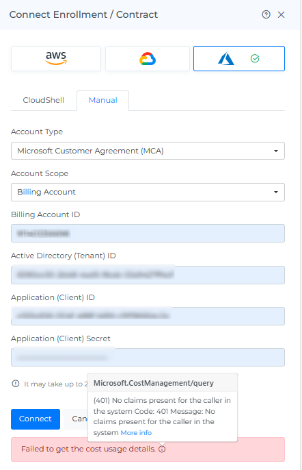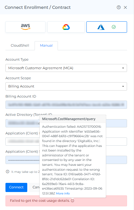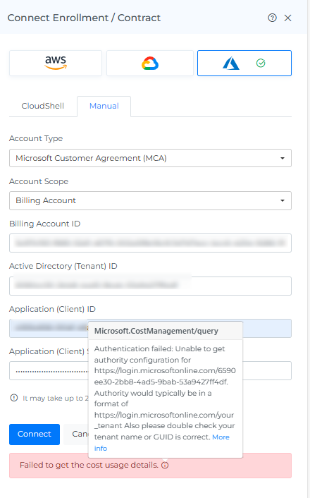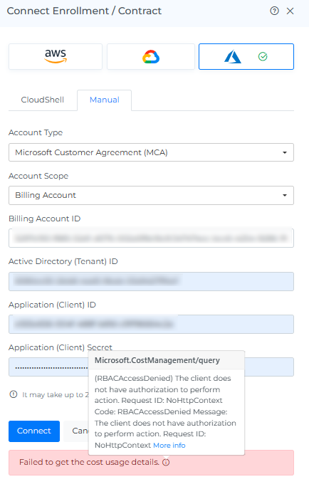If you come across any error message on Mavvrik UI while onboarding Billing account or subscription, please adhere to the following table for resolution.