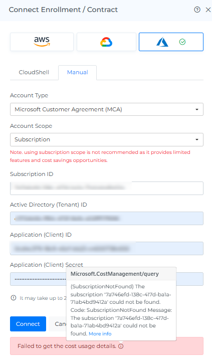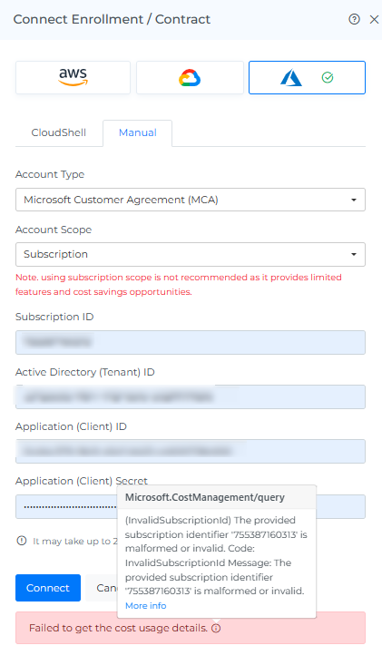 When you come across this error message, it indicates that you've entered the invalid Subscription ID.