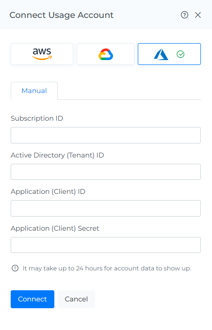 Click on Connect for the subscription under subscriptions tab of Azure & Enter required details