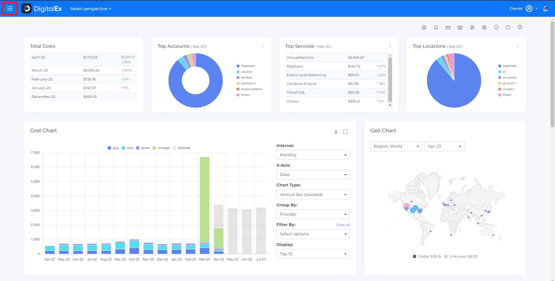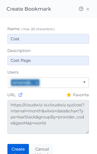If you want to create bookmarks by customizing the dashboard and filtering the cost chart (e.g. selecting a particular interval, provider, service, or location), you can customize the dashboard and filter the cost chart before following these steps