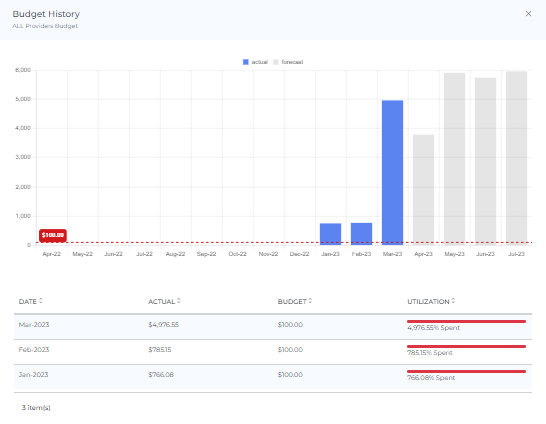 2. The history of budgets will be displayed as follows (the forecast can be viewed on the hovering grey bar chart)