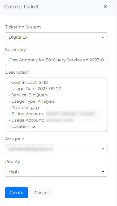 To initiate the ticket creation process for that specific resource, simply click the three dots in the resource's upper right corner and choose "Create Ticket." If you've previously generated a ticket, you will find the "Update Ticket" option available.