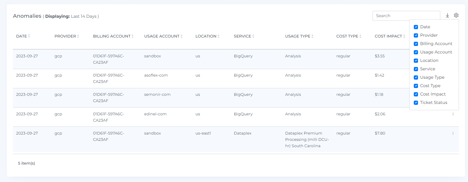 Unexpected or unusual cost fluctuations can trigger anomalies based on the thresholds you've established as shown below. When you select the number of rows, you will be able to view that same quantity of rows on the page."