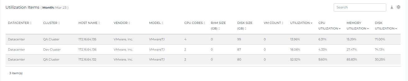 The utilization Items display a list of all the datacenter for the selected month. By default, this list includes all the datacenter that was used during that month. The list includes details such as the datacenter, host name, cluster, and model. This can help you understand the specific datacenter that was used during the selected month and how much money was saved through the use of these datacenter.