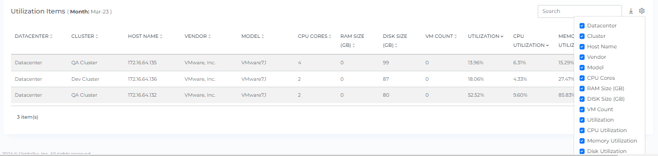 The Utilization Items can be sorted, searched, and downloaded. You can also click on the settings icon to change the way the data is displayed. The number of Utilization Items displayed will depend on the selection you make in the settings. This can help you more easily analyze and understand your datacenter usage.