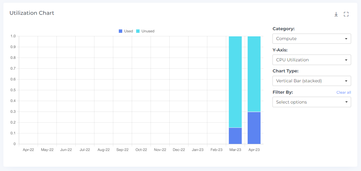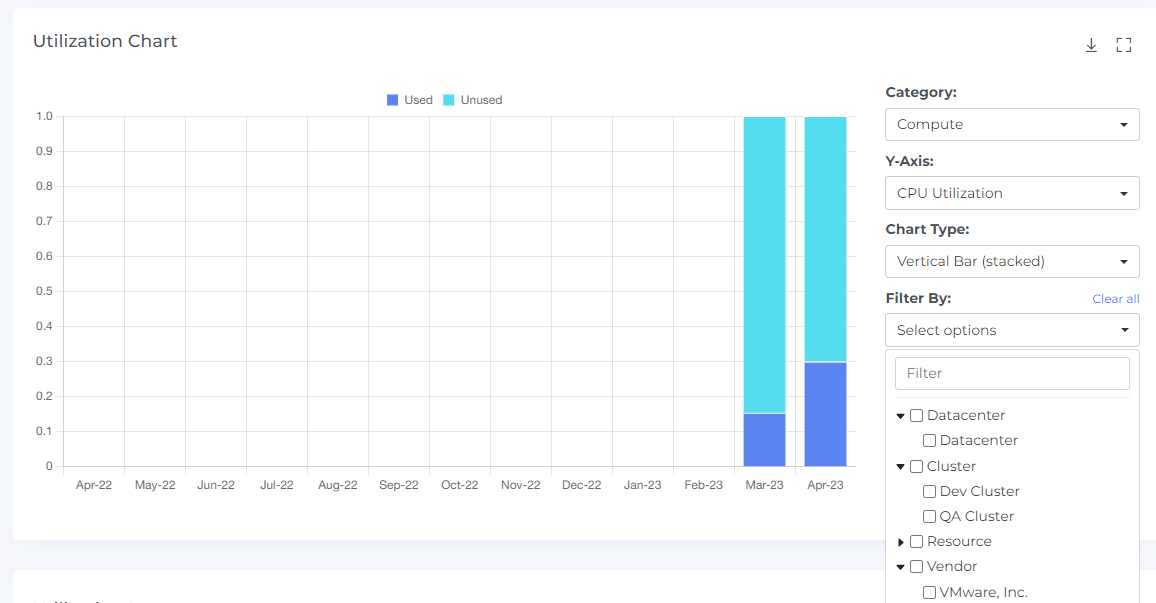 The Utilization Chart allows you to filter the data using various options. For example, you can filter the data by resources, or usage type to narrow down the data and focus on specific aspects of your usage. This can help you better understand and analyze your datacenter usage.