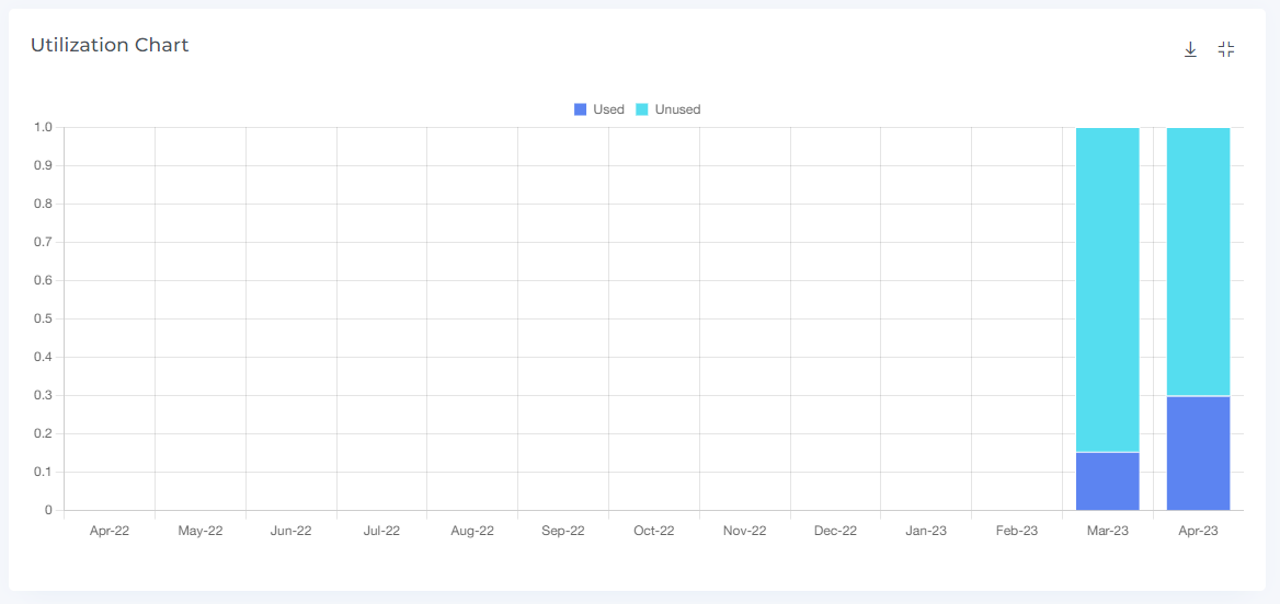 You can expand or restore the view of the Utilization Chart by clicking the square icon. Additionally, you can download the chart by clicking the download icon. This can help you understand the distribution of your datacenter usage over time and identify any trends or patterns.