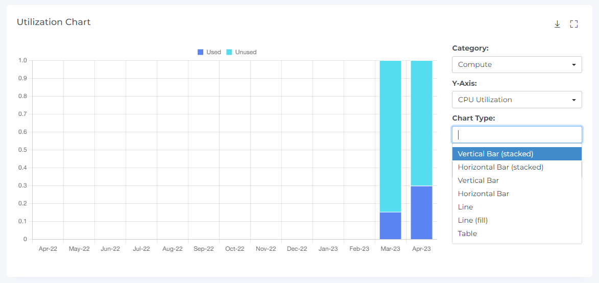 The Utilization Chart allows you to switch between different chart types, such as bar charts and line charts, to visualize the data in different ways. This feature allows you to choose the chart type that best represents the data and helps you understand your datacenter usage more effectively.