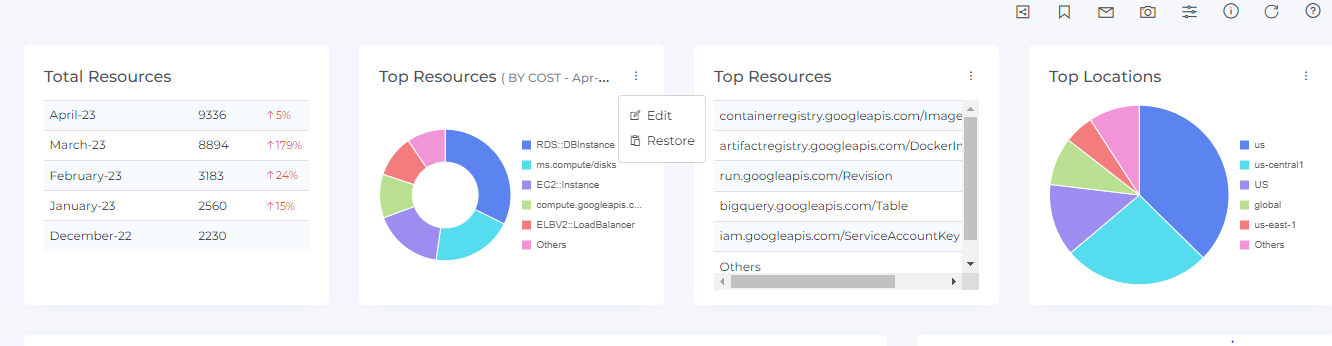 The Top Resources, Top Resources(By Cost), and Top Locations widgets can be customized to suit your specific needs. To customize this widget, you can click on the three dots next to the widget name and select the "Edit" option. This will allow you to adjust the data displayed in the widget based on your preferences.