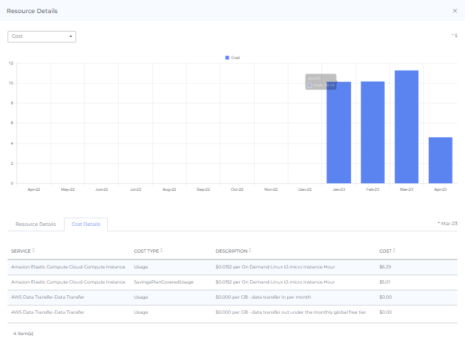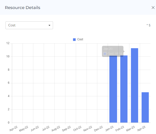 You can mouse hover over the donut chart to view the cost of each individual resource. You can also click on the donut chart to view data for a specific resource. When you do this, the resource chart and resource items table will be updated to display data for the selected resource.