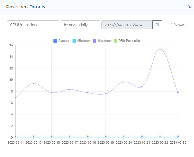 The monitoring graphs (Metrics) for different providers and its services allow users to see the usage and performance of these resources over time. By clicking on the three dots in the corner of the resource instance, users can access the metrics for that particular instance and change the metric type and intervals using the drop-down menu. They can also strikethrough to manage the statistics and hover the mouse over the dots on the line graph to see usage data for daily and hourly intervals. If the daily interval is selected, users can set the date range up to the last 30 days. This type of information can be useful for understanding how resources are being used and for identifying any potential issues or opportunities for optimization.