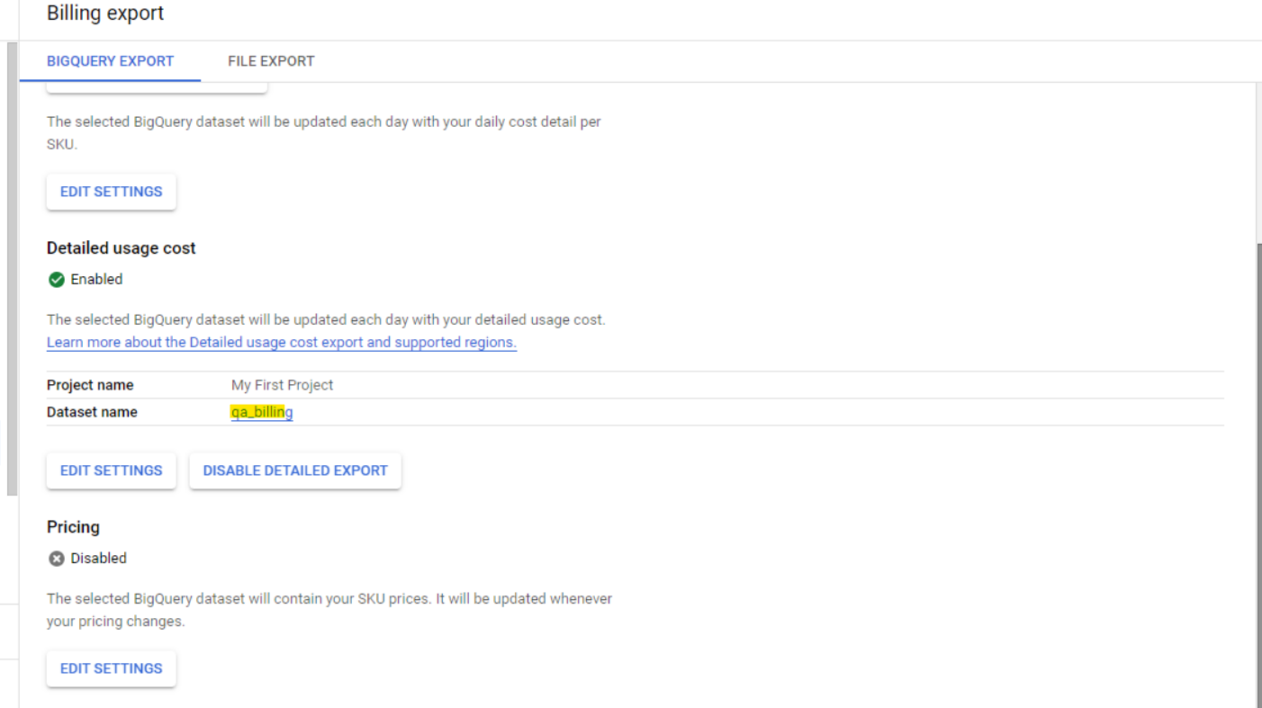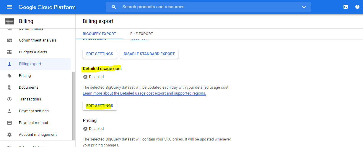 Clicking on Billing export navigates to the below page. Click on Edit settings.