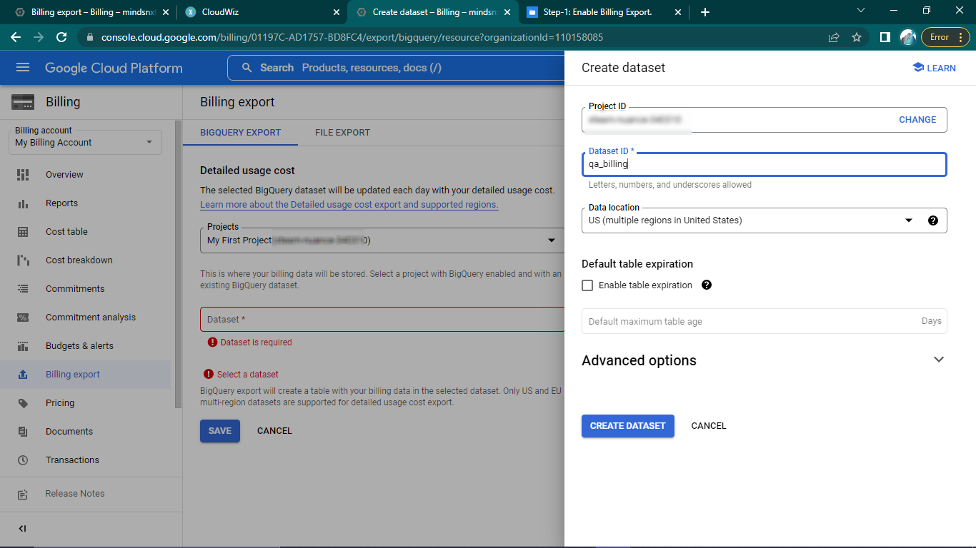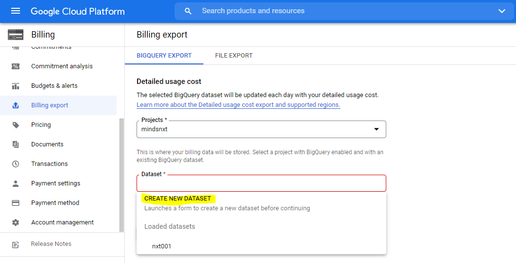 Steps to create Dataset and Enable Billing Export