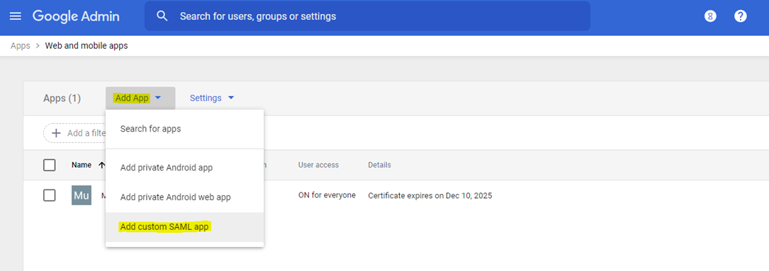 Select Add Custom SAML App.