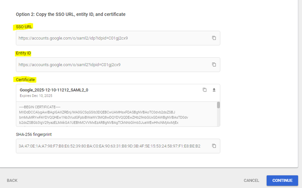 Under option 2 Copy SSO URL, Entity Id, and Certificate from your Google workspace in any of your editor and save it. This is used in the next steps
