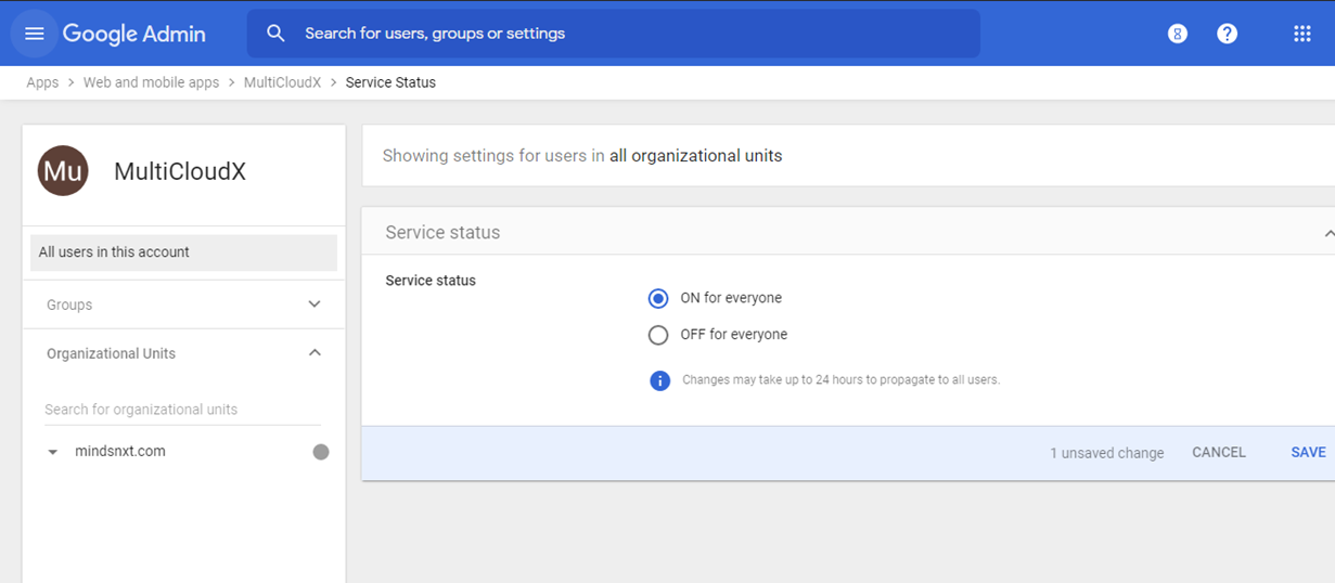 Clicking on the Down Arrow mark navigates to the below page where service status is OFF for everyone by default.