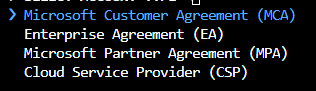 4. It will ask for the account type, select & click enter. (Follow this link to know your account type https://learn.microsoft.com/en-us/azure/cost-management-billing/manage/view-all-accounts#check-the-type-of-your-account )