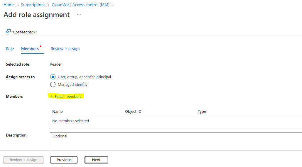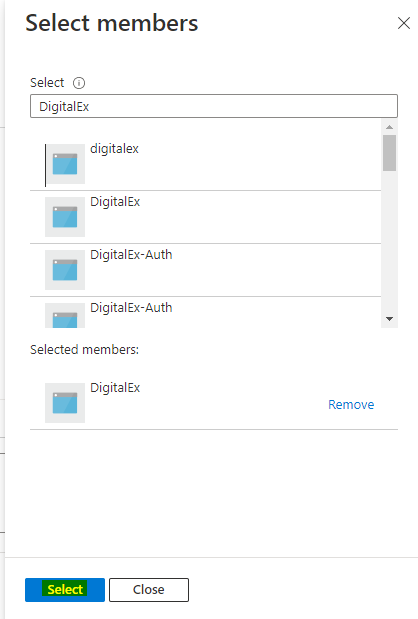 8. Enter the App name (which you have created in Step-1 : Create Azure Active Directory app ) & Click Select
